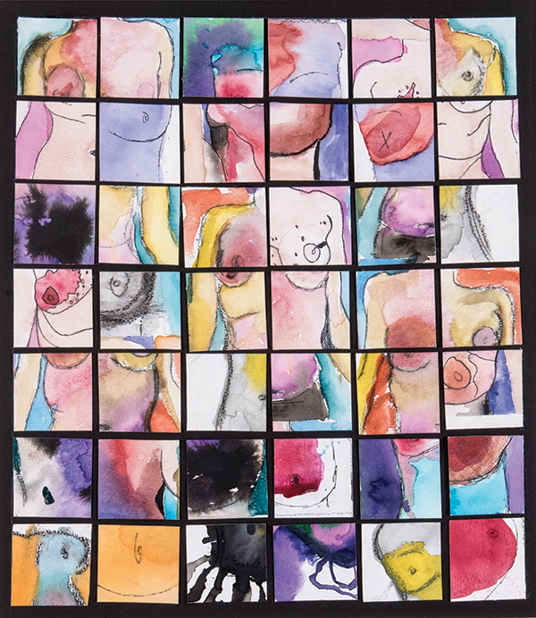I created this piece by cutting up 10 different paintings and then rearranging them to create an abstract grid composition. The pieces represent the different effects breast cancer can have on different people, both now and later in their lives. It also represented the colorful personality that my grandmother exuberated during her life, before falling victim to cancer. I chose to title my piece 42/252,710 because there are currently 252,710 breast cancer victims in 2017.