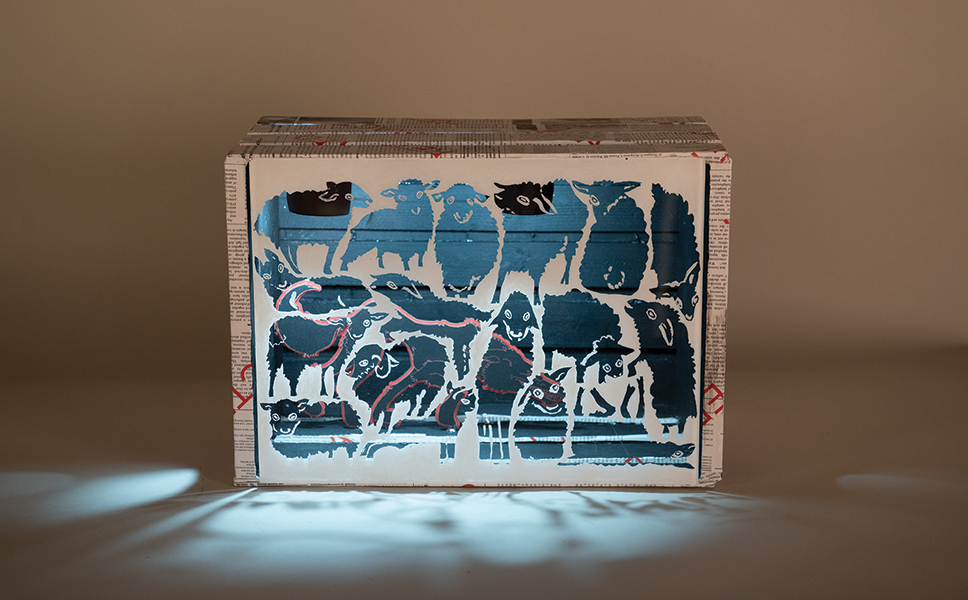 This piece was created based on Diana Fekete’s “The Individual and Global Benefits of Immunizations.” I was inspired by the concept of herd immunity being weakened by an under-vaccinated community. The wolf is the personification of disease breaking through the vaccine barrier and infiltrating the community. The box represents a fence surrounding sheep and also the previously mentioned vaccine barrier. Through the sheep on the glass, the viewer can see where disease is entering through the weakened “fence.” The “fence” is covered with articles of Dr. Wakefield, the man who weakened society’s faith in immunization.