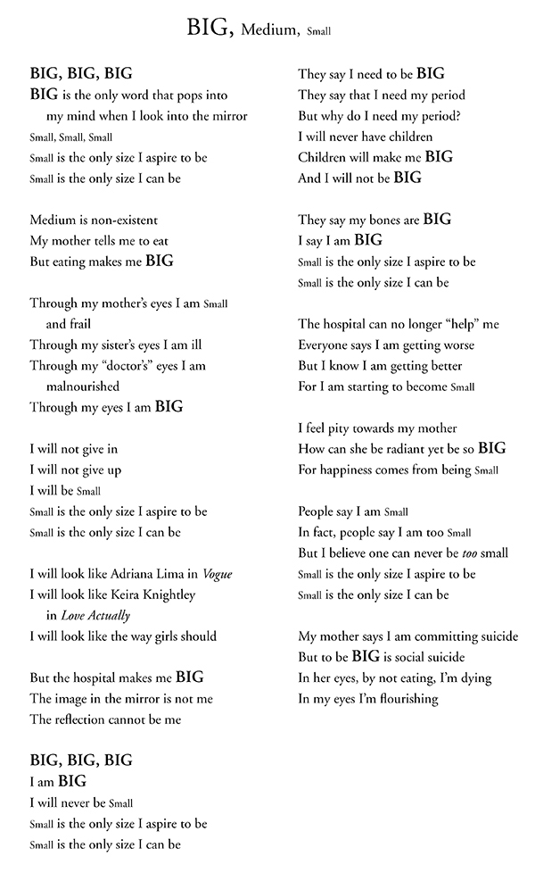 After I read the study on “Bone Structure and Weight at Time of Restoration of Menses in Amenorrheic Youth With Eating Disorders,” I felt drawn to the topic. The main character in the poem is narrating, through her eyes, the struggles of eating disorders. Just like the information presented in Meredith Modlin’s study, the doctors are trying to restart the character’s menstrual cycle, which was lost due to her eating disorder. The size of the texts represents the narrator’s representation of body size. I chose to literally represent the character’s views on body size so the reader can visualize how she truly feels about her body.